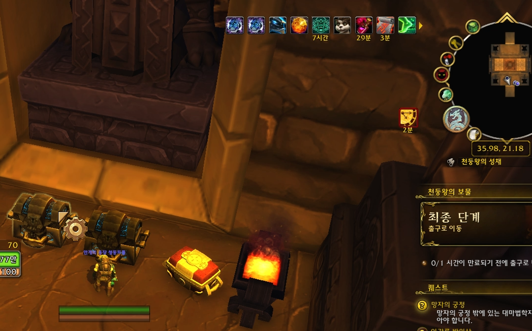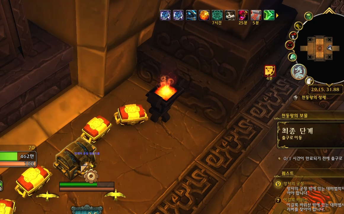[싹 다 훔쳐] 유산 업적은 판다리아의 안개 확장팩 당시에만 달성할 수 있었던 업적이라고 합니다. 그런데 판다리아 리믹스 이벤트가 열리고나서 이 유산 업적을 달성할 수 있다는 정보글을 봤습니다. 선리버 돌격대 지원 일일퀘스트를 하루 한 번 완료 시 '레이 션 궁전으로 통하는 문의 열쇠'를 한 개 획득할 수 있고, 이 열쇠를 갖고 '타오스' npc(/way 51.37 46.28)한테 말걸면 '천둥왕의 보물' 씨나리오에 입장할 수 있습니다. 제한 시간이 있습니다. 5분 내에 최대한 많은 보물상자를 열어서 각종 아이템을 획득하고 함정을 피하며 세 군데의 문을 열고 마지막 구역의 보스인 '괴물신 굴칸'을 쓰러뜨리는 것이 핵심입니다.