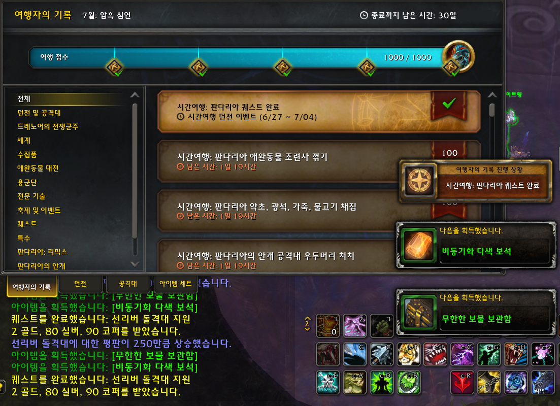 시간여행: 판다리아 퀘스트 완료 100 (일퀘도 가능! 특히, 평판 지원 반복퀘 카운트됨!)