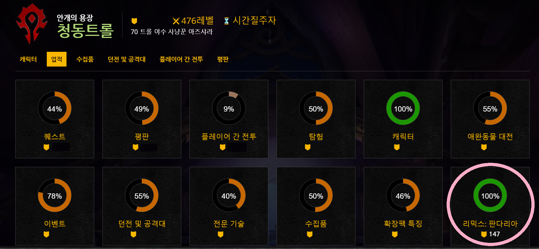 월드오브워크래프트 공식사이트의 전투정보실에서 업적 진행도 100%를 확인하였습니다.