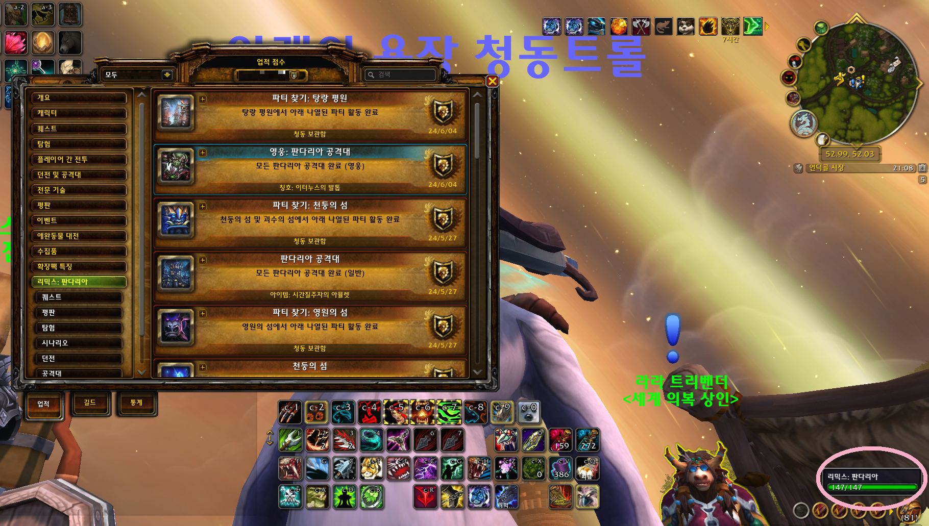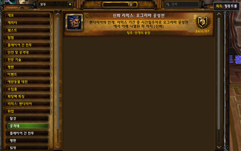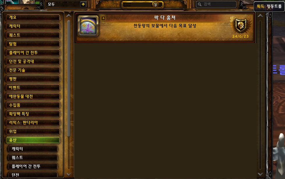 | 와우 판다리아 리믹스 [싹 다 훔쳐] 유산 업적 달성!! (0) | 2024.06.23 |