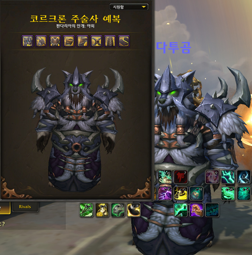 판다리아 리믹스 판다리아 전역에 있는 무한의 시장에 '라라 트리벤더'라는 세계 의복 상인 npc가 있습니다. 말걸면 여러가지 다양한 형상세트를 판매하고 있습니다. 그중에 '코르크론 주술사 예