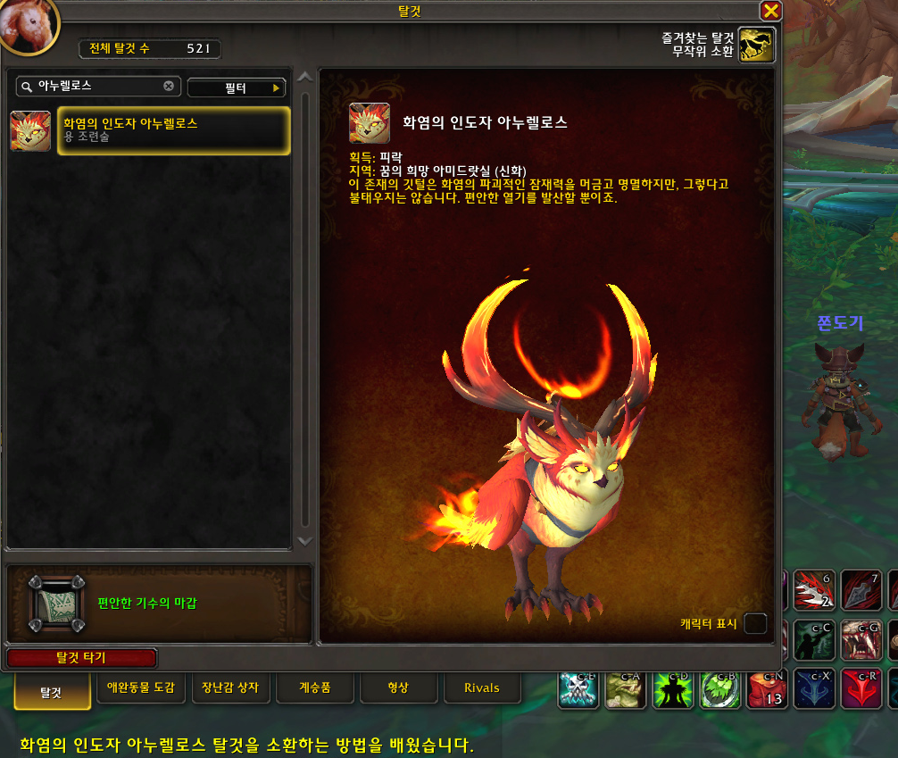 용군단 3시즌 '에메랄드의 꿈'이 열리고 추가된 탈것들 중에 가장 갖고싶었던 탈것, 용조련술 비행이 가능한 탈것이 바로 불부엉이(조드 X) '아누렐로스'였습니다. 공격대 참여할 실력이 안 되어서 3시즌 패스하고 골드를 모아서 4시즌이 되어 각성 공격대로 템렙을 더욱 올린 공격대에 탈것 손님으로 신청하여 비각성 아미드랏실 신화 난이도에 참여했습니다.