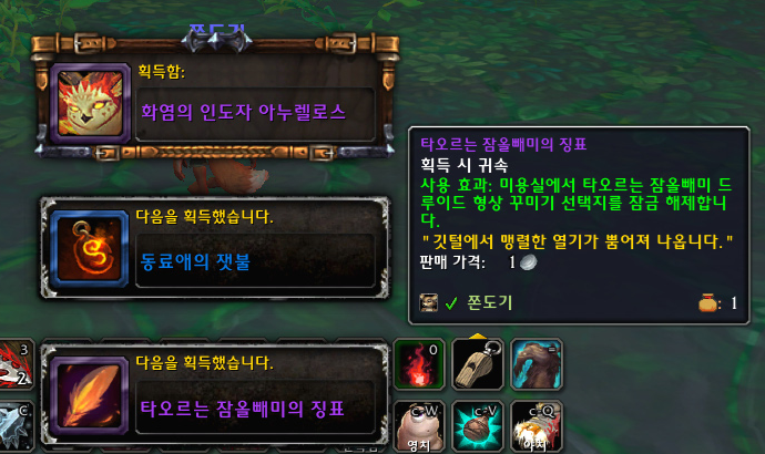 '동료애의 잿불'과 '타오르는 잠올빼미의 징표'입니다. 이게 무엇인지는 탈것 스샷들을 보여드린 후에 말씀드리겠습니다.