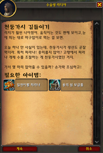 4일째는 북슬북슬한 산악 가죽 20개, 용섬 보급품 150개 필요합니다.