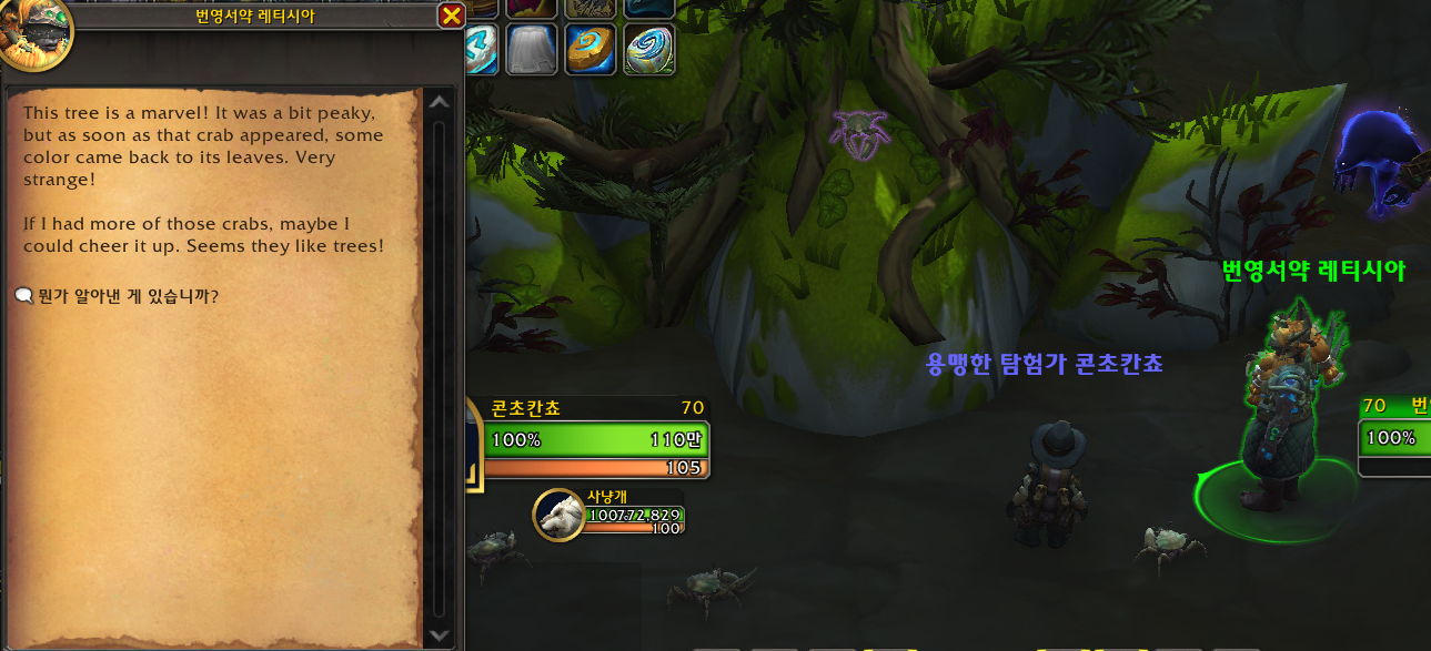들어가보니 작은 바위에 나무가 자라있고 나무 밑에 '진줏빛 껍질게'가 있었습니다. 그리고 그 앞에 '번영서약 레티시아'라는 npc가 서있어서 말걸어봤는데 외국인이었습니다! 영어로 뭐라뭐라하던데 못 알아들었지만 무슨 막대기를 줬습니다. 막대기를 보니 게를 바른 길로 인도하게 만드는 막대기였습니다. 눈앞의 게한테 사용해봐도 아무 효과가 없어서 구글에 '진줏빛 껍질게'라고 검색했는데 안 떠서 혹시나 구글 번역을 통해 'wow Pearl shell crab'이라고 다시 검색해봤더니 와우헤드글이 있습니다. 역시 댓글에 어떤 초고수 외국인 와우저께서 해결방법을 알려주었습니다.