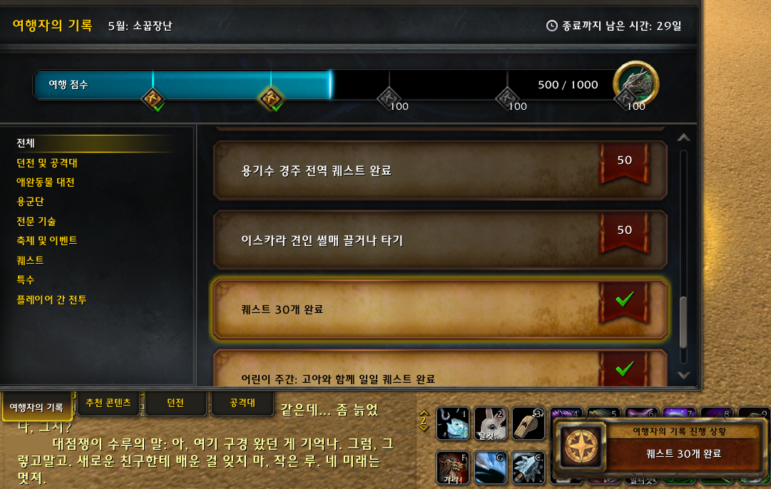 어린이 주간 고아가 주는 연퀘들 덕분에 퀘스트 30개 완료하는 것이 쉬웠고 지루하지 않았어요. (+200점)
