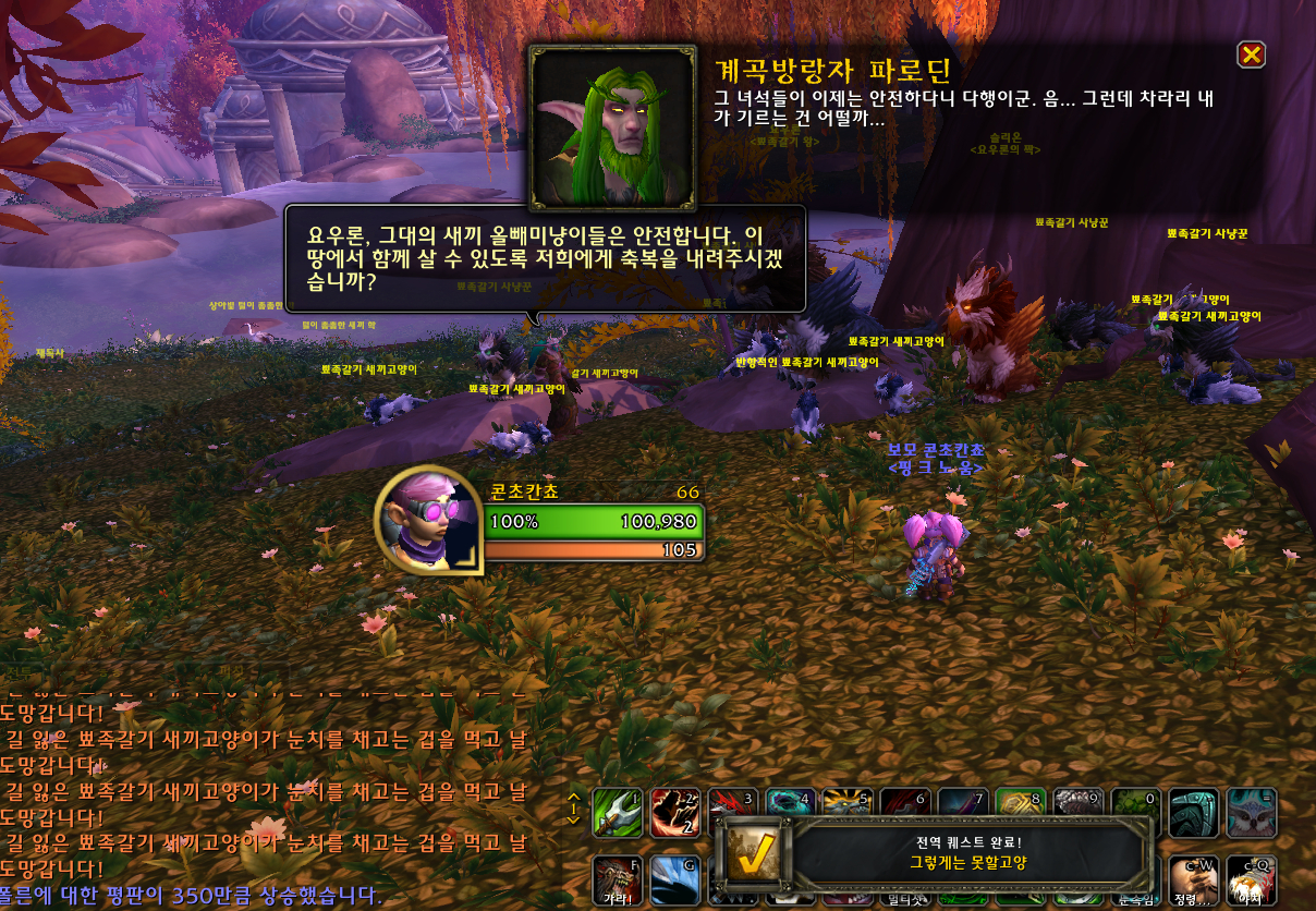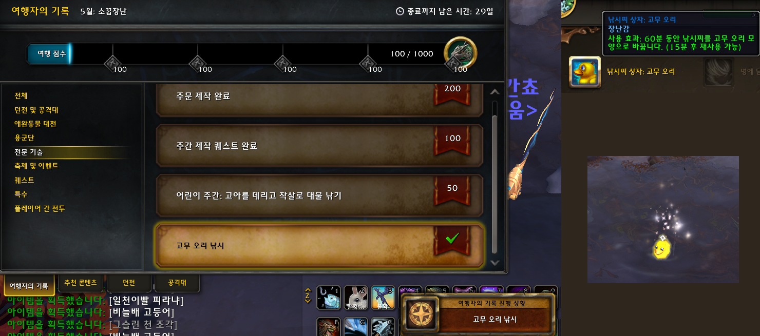 호루라기로 고아를 소환해서 애완동물 대전 일퀘(애완동물 조련사), 스톰윈드 낚시 일퀘했어요! (+100점)