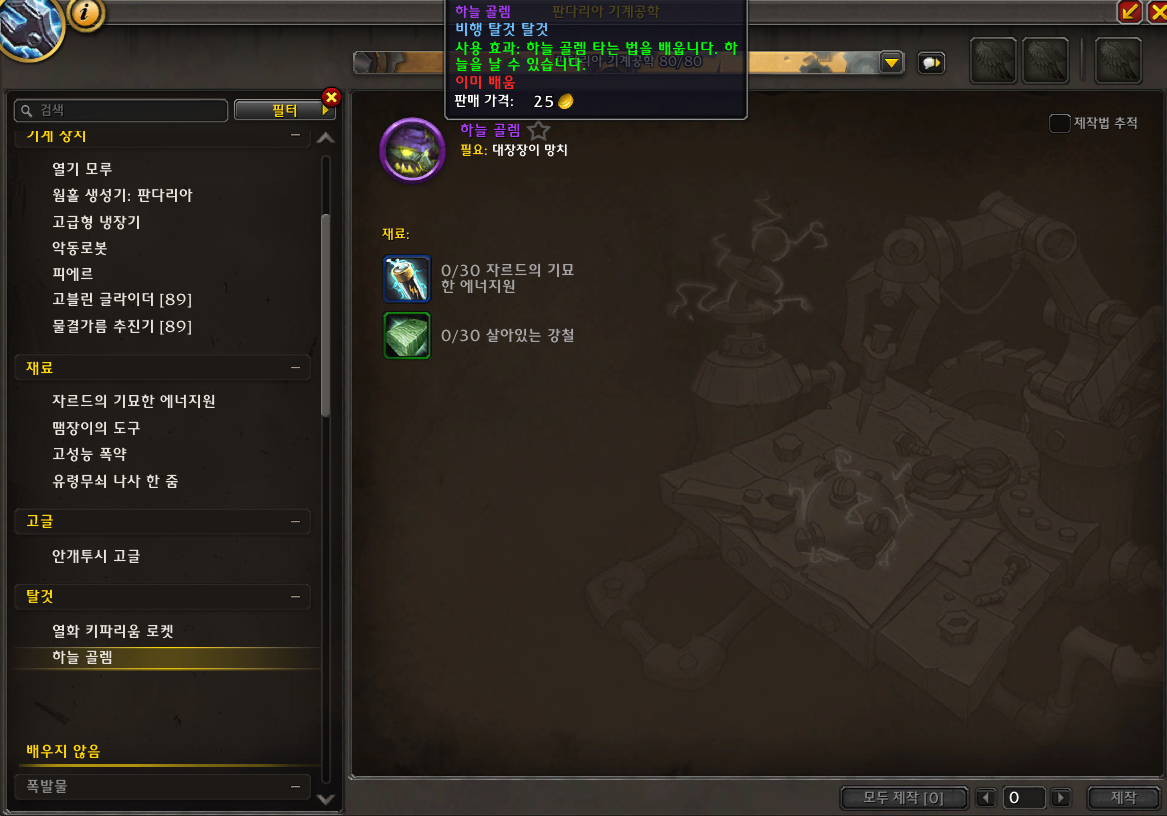그전에 판다리아 필드의 몹한테서 낮은 확률로 드랍하는 '설계도: 선임기술자 자르드의 일지'템을 획득하고 사용해야 됩니다. 탈것 제작 재료는 다음과 같습니다.