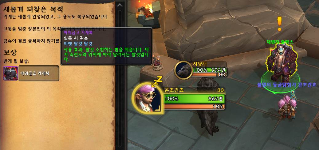 구글과 유튜브 등을 통해 검색해보니까 연속 퀘스트를 수행 후 최종 보상으로 탈것을 주는데 탈것 이름은 '바위금고 기계복'입니다. '고철 압축기', '기계 방어 장치'와 같은 모델의 다른 색 탈것입니다.