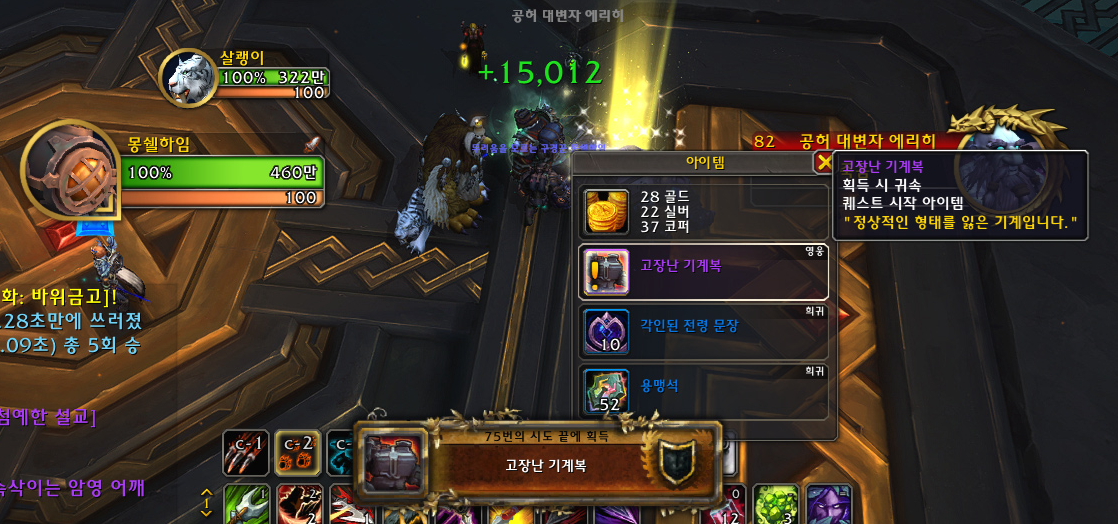와우 내부전쟁 1시즌 던전들 중 하나인 '바위금고'의 막넴 '공허 대변자 에리히'한테서 '고장난 기계복'이라는 매우 희귀하여 드랍률이 낮은 퀘스트 시작 아이템을 신화 난이도, 쐐기에서만 획득할 수 있습니다.