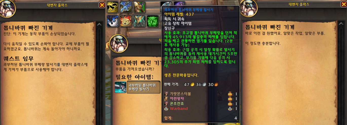 첫 번째 장신구는 과부하된 톱니바퀴 부메랑 발사기입니다. 전투부대 은행에 보관중이던 장신구로 퀘완했습니다.