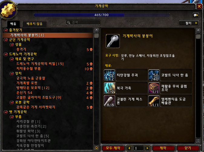 구입하고 설계도를 배워서 확인해보니 처음 보는 재료들(재활용 무쇠 골렘 조각, 고블린 기계 피스톤, 엘레멘티움 도금 배출관)이 있어서 검색해보았습니다.