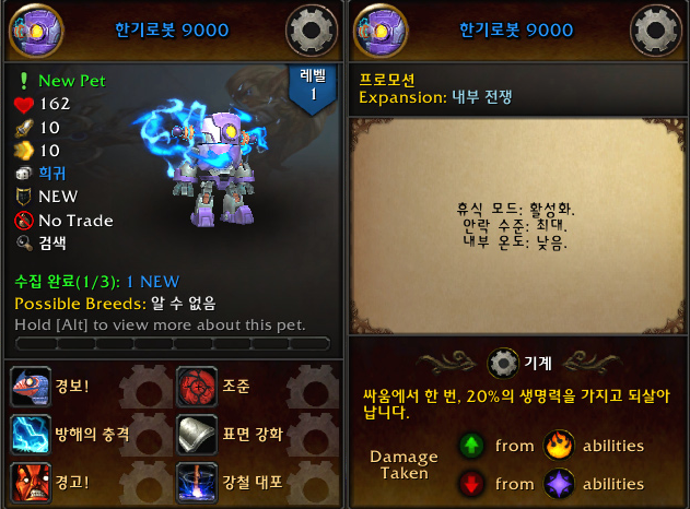 용군단 확장팩 콘텐츠 중 하나인 시간의 균열을 하면 얻을 수 있는 '학살로봇 9000'과 같은 모델에 다른 색이지만 Blackberry 마운틴 듀 음료를 뒤집어 쓴 색다른 맛이 나는 애완동물을 한 마리쯤 갖고 싶었습니다.