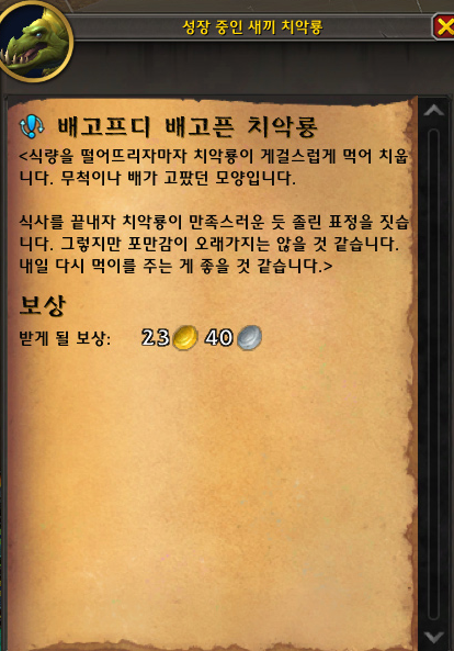 그리고 '성장 중인 새끼 치악룡'으로 살짝 몸 크기가 커진 상태로 1일차 퀘스트 완료입니다.
