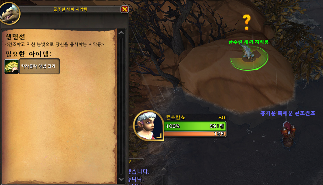 언덕 위에 치악룡들에게 둘러싸인 고블린 npc '젝셀 핑거스냅'한테 말을 걸면 되겠습니다.