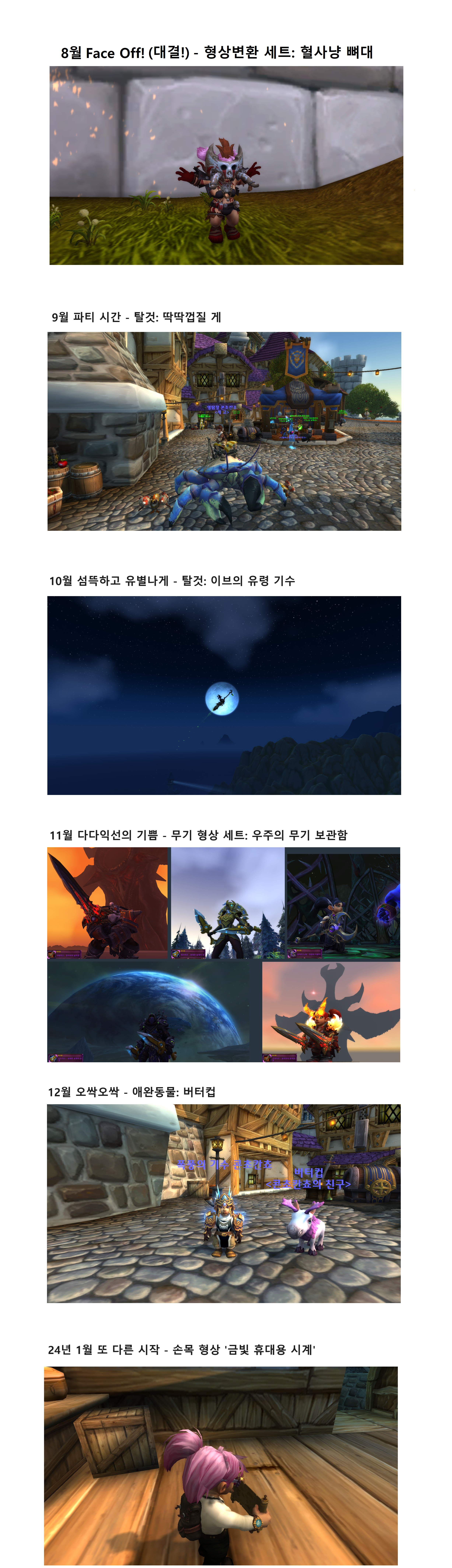 한눈에 보는 23년 2월 ~ 24년 1월 와우 교역소 월간 보상 모음입니다.