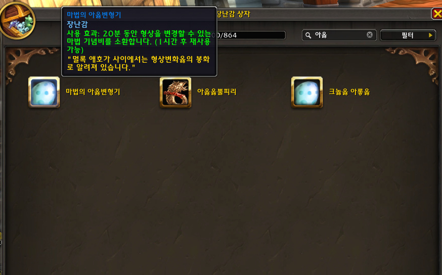 | '빛의 티끌'(와우 군단 부서진섬 달라란 '줄이오스'한테서 수수께끼의 동전 50개로 구입 장난감) (0) | 2024.02.13 |