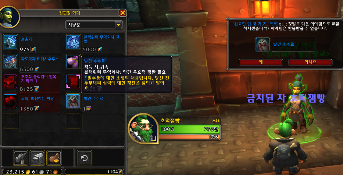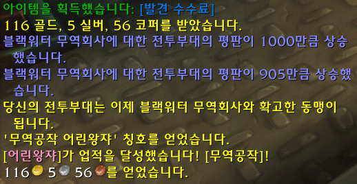 마지막 1000은 블랙워터 확고 동맹 구입 탈것과 잘 어울릴 색깔의 의상을 입은 캐릭으로 '완료한 안녕거기 목록'을 '발견 수수료'와 교환했습니다.