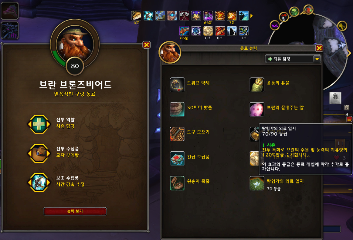 탐험가의 의료 일지 70등급에 브란의 주문 및 능력의 치유량이 120%만큼 증가합니다.